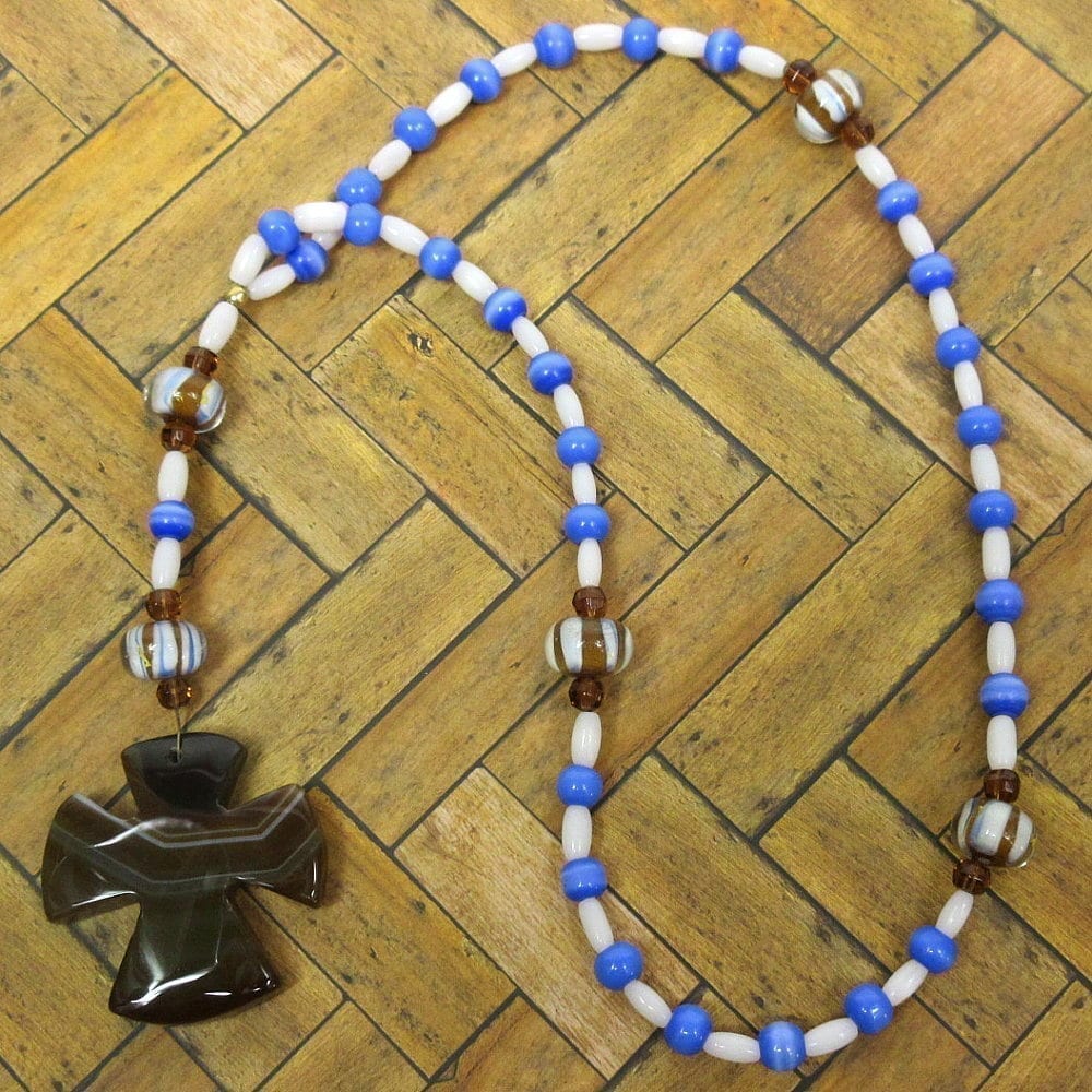 Brown, blue, and white striped taffy-ball-like glass Cruciform beads, blue cat’s eye round Week beads, oblong white cat’s eye spacer beads, and a white-striped brown agate cross are featured on this 15 inch set of Anglican Prayer Beads.
