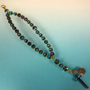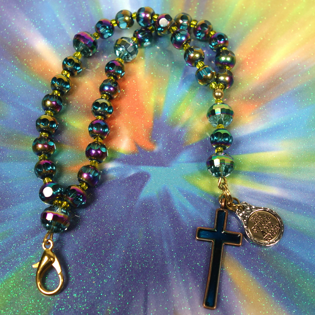 Rainbow-ringed faceted aqua Cruciform beads and cathedral-cut aqua glass Week beads grace this Protestant Prayer Bead bracelet. Dangling from it are a matching resin-filled metal cross and a pendant that says “Be still and know.”