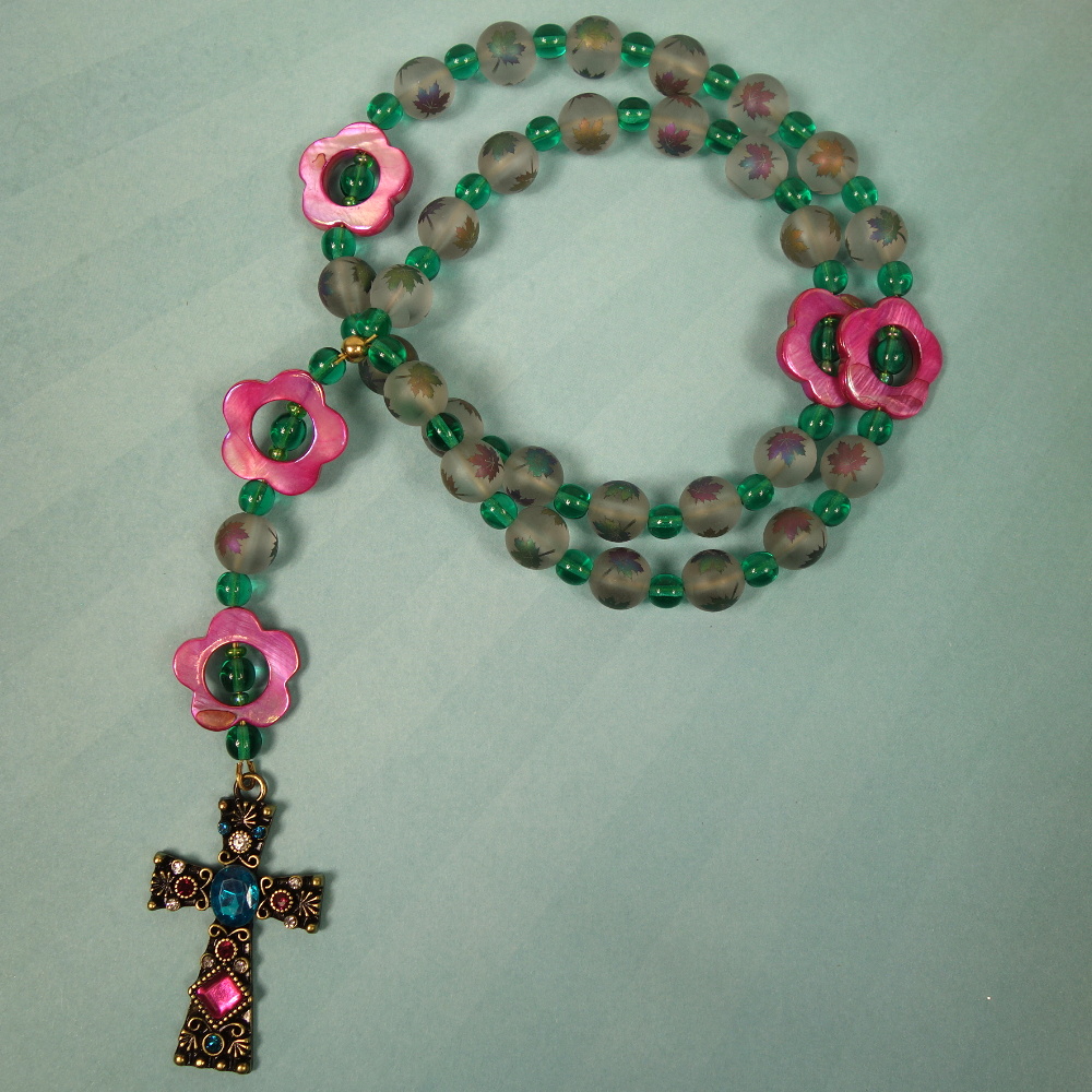 Pink-to-aqua color-changing maple leaves grace the Week beads on these Protestant prayer beads. Transparent aqua spacer beads also fill the centers of the pink flower-shaped Cruciform beads. A matching filigreed rhinestoned cross completes the design. These unique beads are especially beautiful and will definitely appeal to nature lovers.