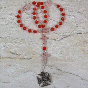 Red and white flowered crosses, red beads, and a pewter Celtic cross grace these Protestant prayer beads.